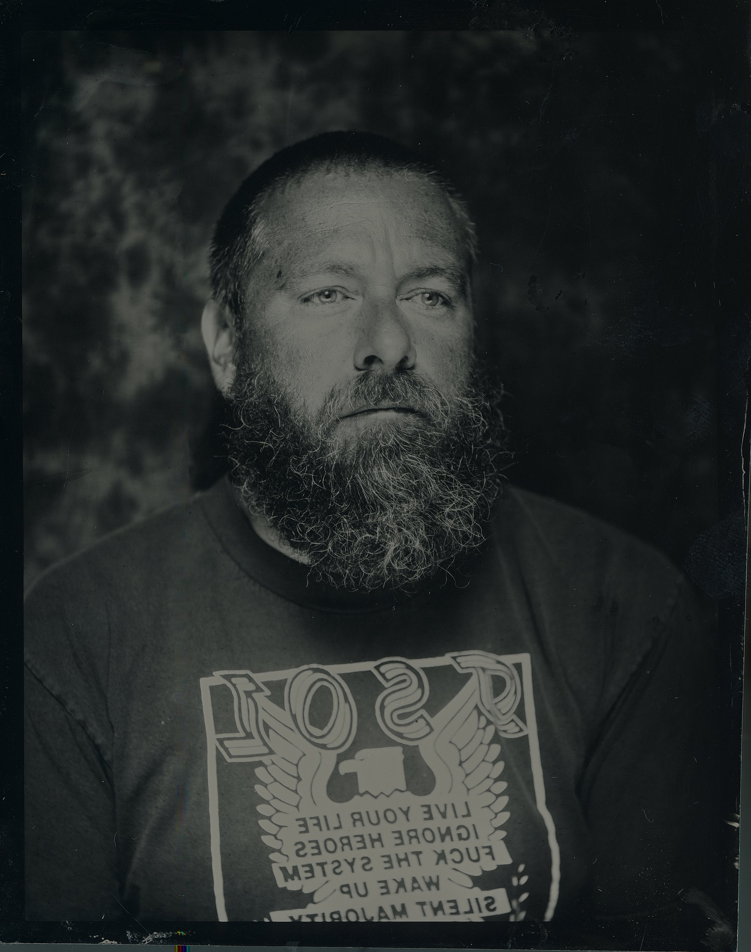 The wet plate collodion process dates back to the early 1851. It is a labor-intensive process where ethanol, nitrocellulose, iodides, and bromides are poured onto metal or glass and then plunged into a bath of silver nitrate. This interaction with the silver makes the mixture poured on the plate light-sensitive. It is loaded into a unique holder and loaded into the camera. I will then need to take and develop the plate before the mixture dries, hence the name wet plate. One hundred fifty years ago, exposures were very long minutes. You had to stand completely still. That’s why everyone seems to never smile in photos. Luckily, with a modern take, I can speed up that process to just a few seconds. It is essential to stay entirely still; any movement will soften your image.